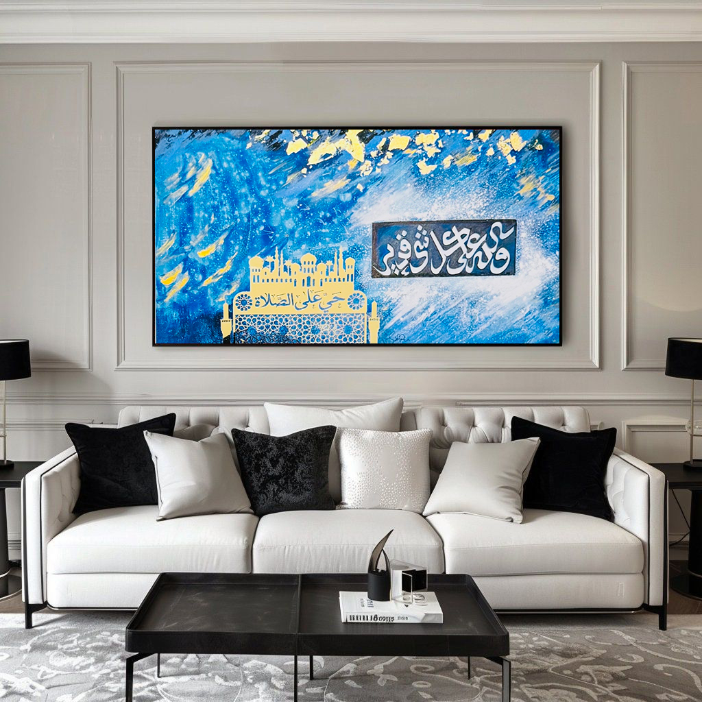 - The painting blends spiritual symbolism, celestial atmosphere, and traditional Islamic motifs.