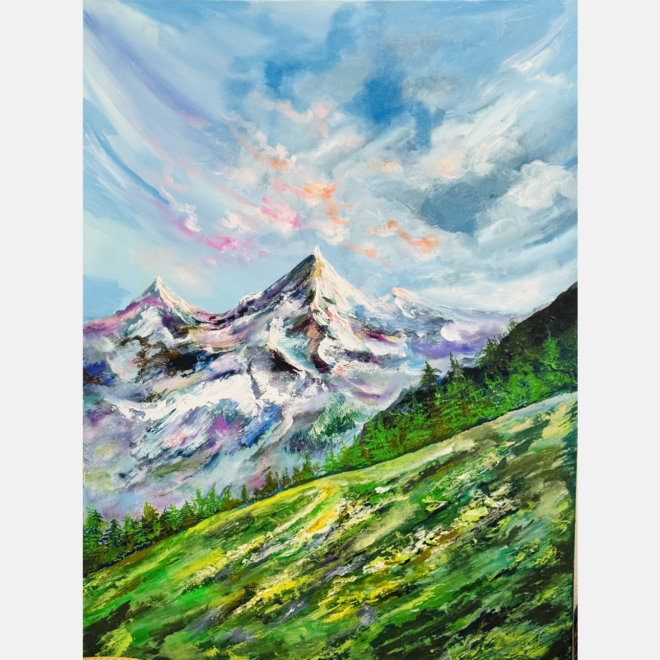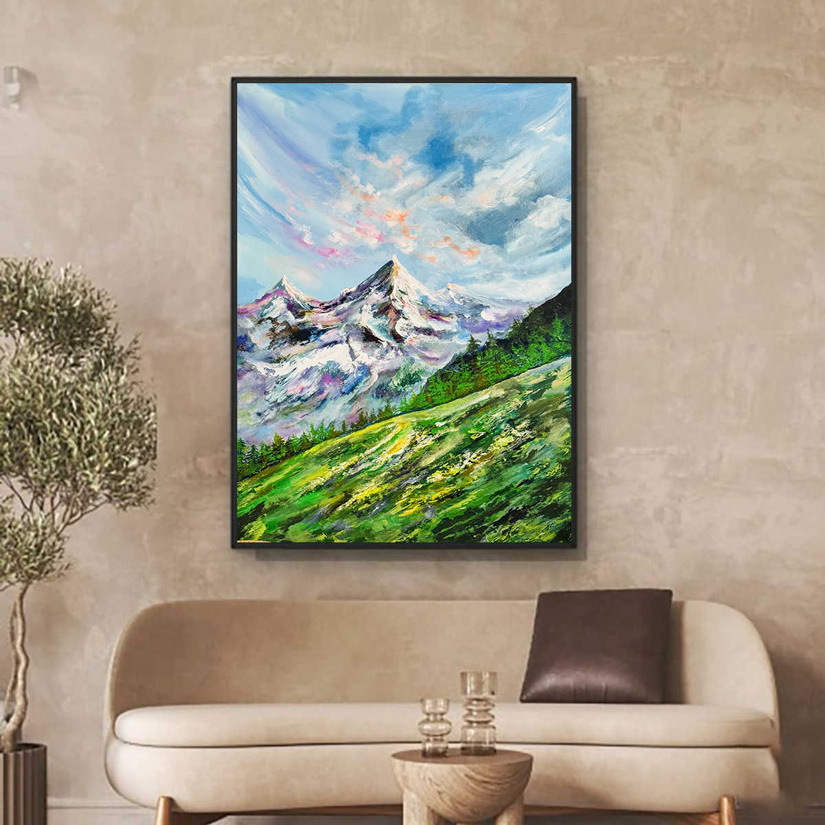 Overall, the painting feels both majestic and dynamic. The contrast between the serene green meadow and the powerful, towering mountains evokes awe and movement—an expressive celebration of nature’s grandeur rather than a strictly realistic landscape.