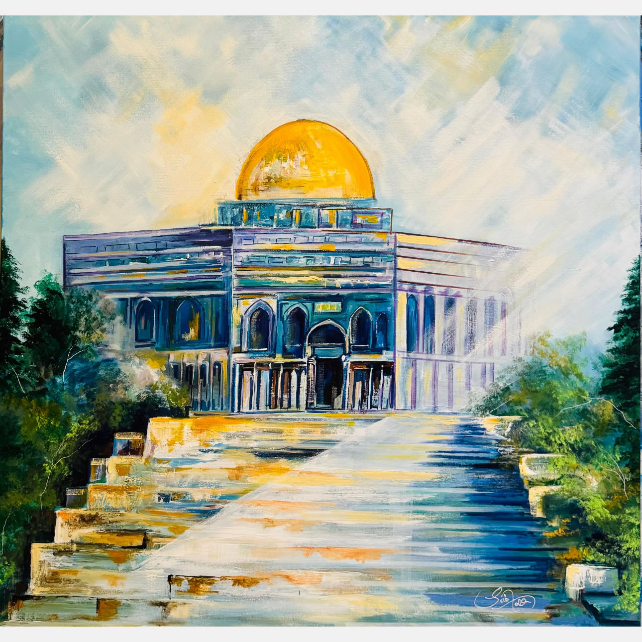 The painting depicts a grand domed building, likely inspired by the Dome of the Rock, centered at the top of a wide stone stairway. The structure features a large, radiant golden dome that glows warmly against a soft, airy sky filled with sweeping strokes of pale blue, white, and hints of yellow.