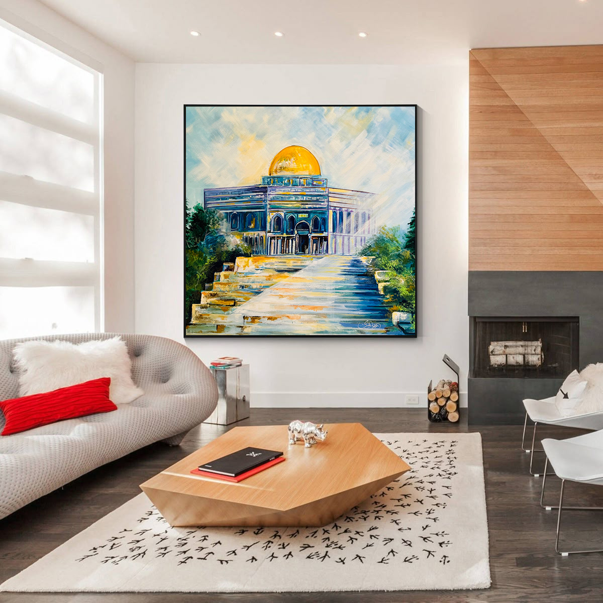 Acrylics on gallery wrapped canvas Size: 48x48 This painting depicts a grand Mughal-style architectural scene viewed through an ornate archway. The arch frames a large mosque-like structure with multiple domes and tall minarets, painted in rich shades of red, orange, and gold. The perspective leads the viewer’s eye through the central gateway toward the main courtyard, where small human figures walk across a sunlit plaza rendered in warm, glowing hues. The sky above is a soft blend of blues, whites, and pale yellows, suggesting a bright afternoon with scattered clouds. The arch itself is elaborately decorated with floral and geometric motifs in teal, gold, and brown tones, creating a strong contrast with the vibrant architecture it frames. The overall composition evokes a sense of cultural grandeur and spiritual serenity, capturing the elegance of South Asian or Islamic architectural heritage. On the right, flowing organic patterns of flowers and vines dominate the composition. The flowers, painted in lively pinks and blues with touches of gold, seem to swirl upward, intertwining with the building. Gold filigree lines and curving stems connect the natural and architectural elements, creating a sense of unity and movement. The background consists of soft, blended hues of beige, gold, and sky blue, overlaid with faint circular and geometric patterns that add depth and texture. The entire piece has a luxurious, almost ethereal feel — fusing nature and architecture in a harmonious, ornamental design.