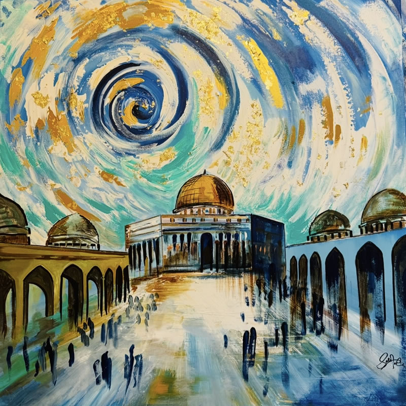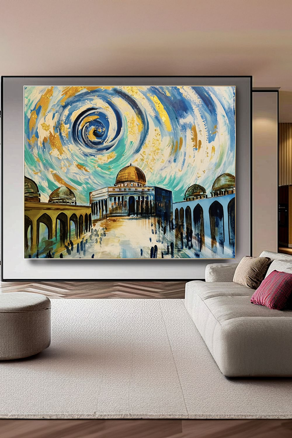 This painting is a vibrant, expressive depiction of a famous Islamic architectural site. Here are its key visual features: