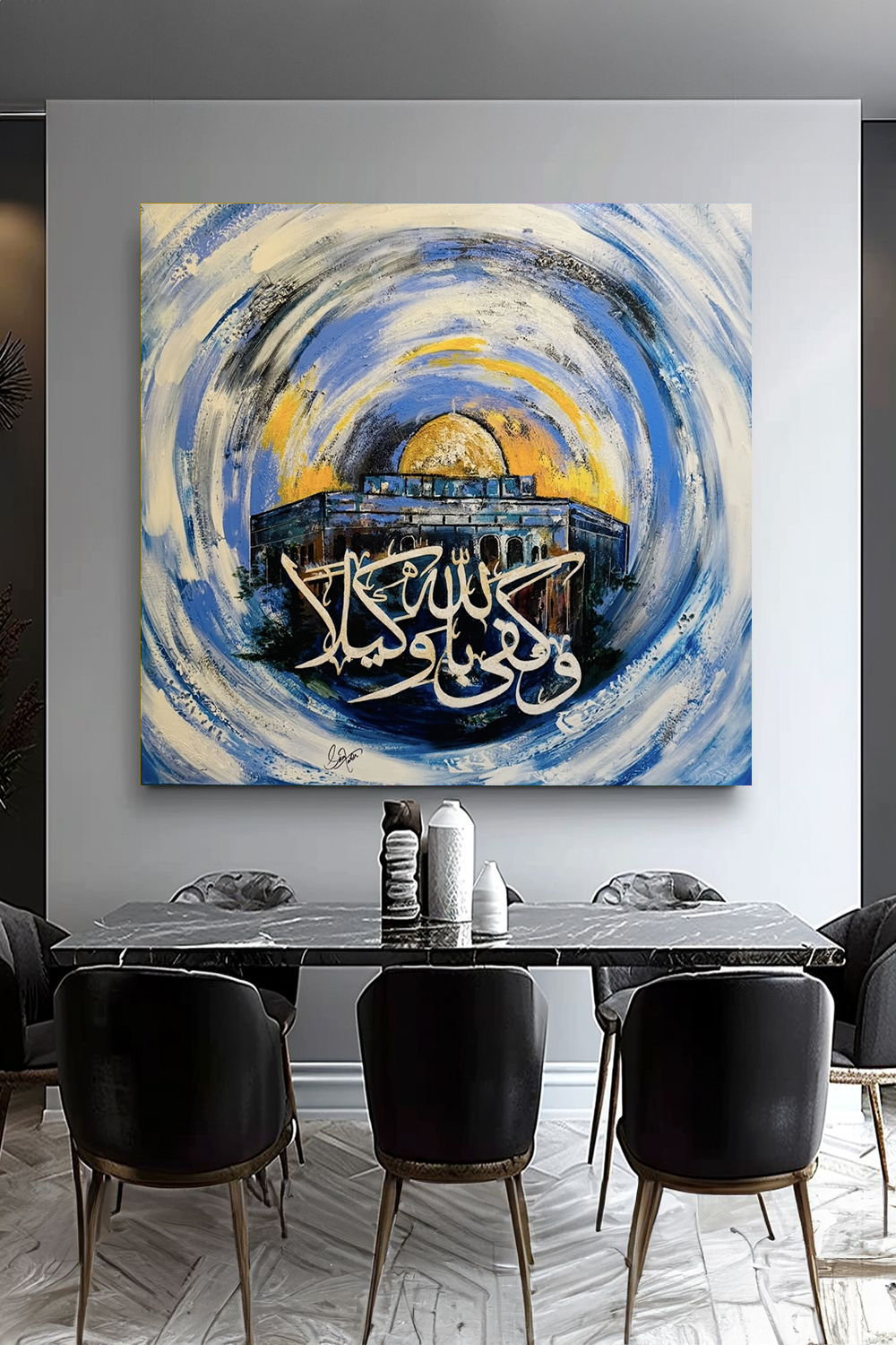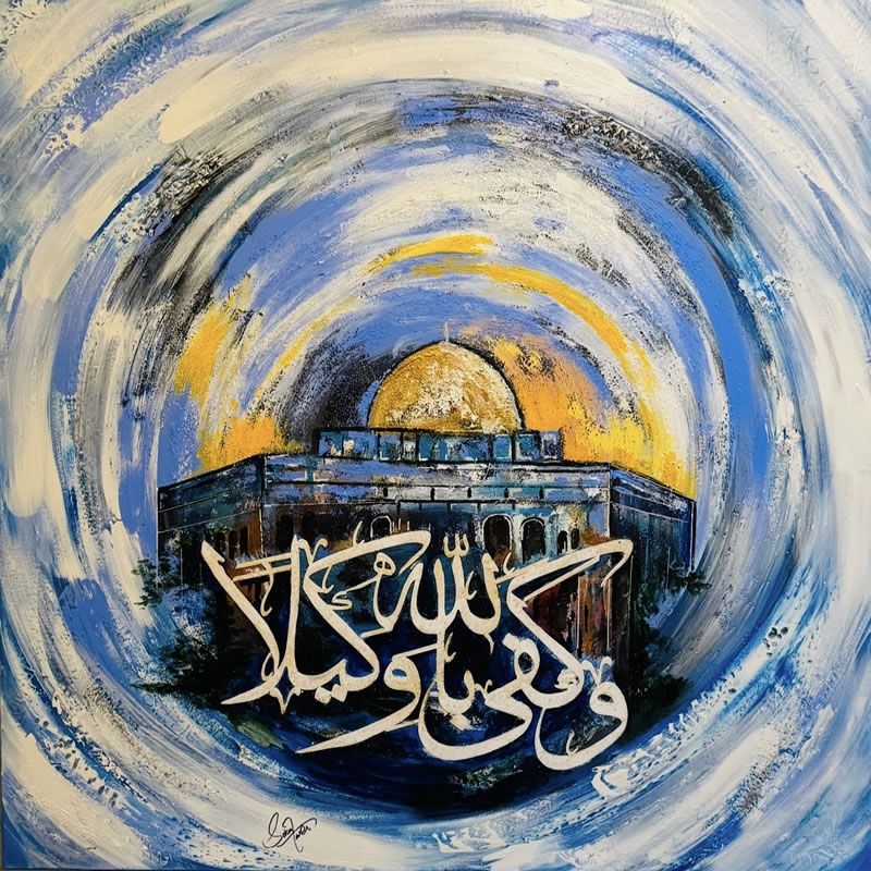 The Dome of the Rock is the focal point, depicted with a golden dome that catches warm tones of yellow and orange. The building beneath is painted in deep blues and dark tones, giving it weight and presence. - Calligraphy:
